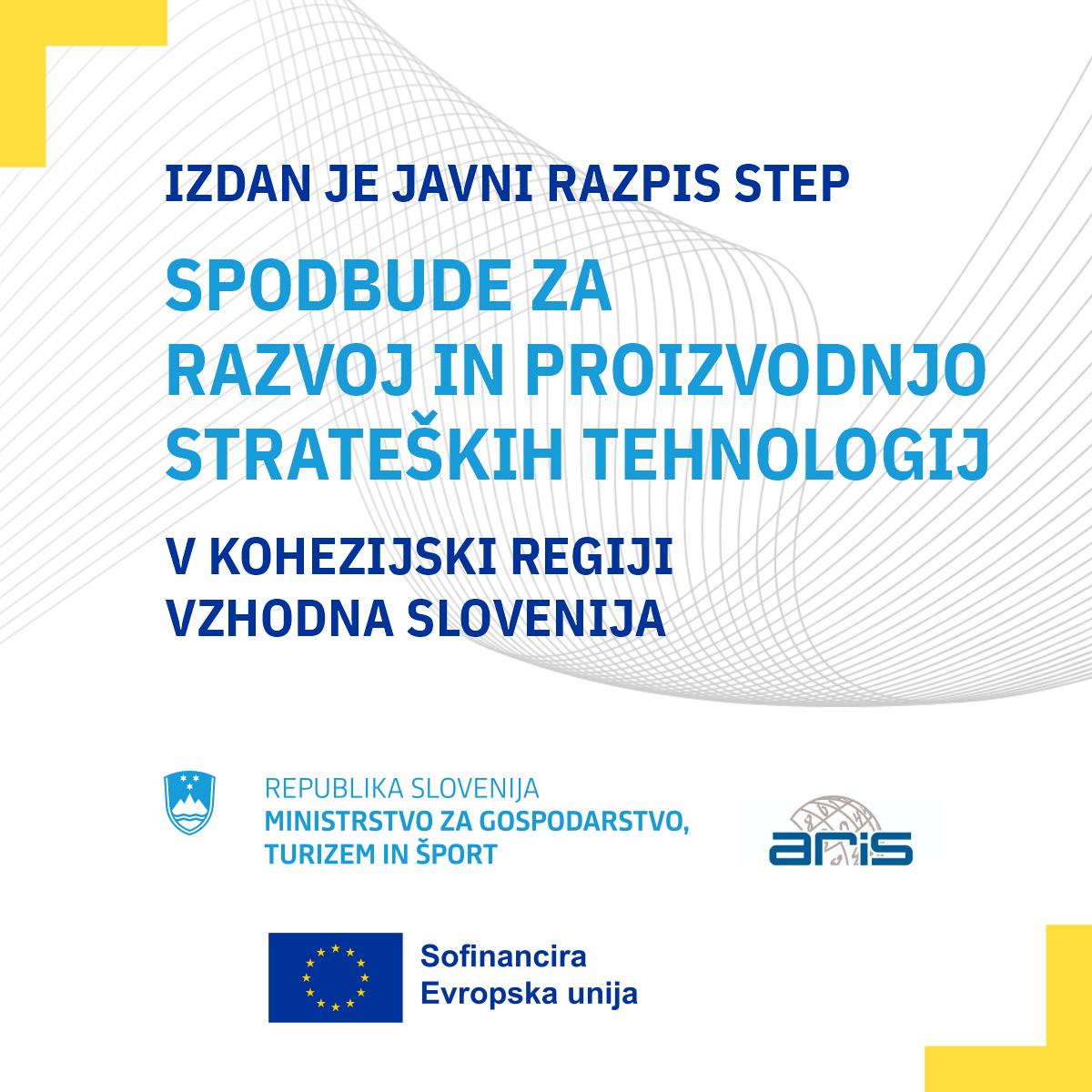 Objavljen je javni razpis »STEP – Spodbude za razvoj in proizvodnjo strateških tehnologij za Evropo (JR STEP)«, ki se sofinancira iz Evropskega sklada za regionalni razvoj (ESRR), v okviru Programa evropske kohezijske politike v obdobju 2021–2027. Sredstva razpisa so namenjena operacijam, ki se bodo izvajale zgolj v programskem območju kohezijska regija Vzhodna Slovenija. V letu 2026 pa pričakujemo objavo novega javnega razpisa še za kohezijsko regijo Zahodna Slovenija.